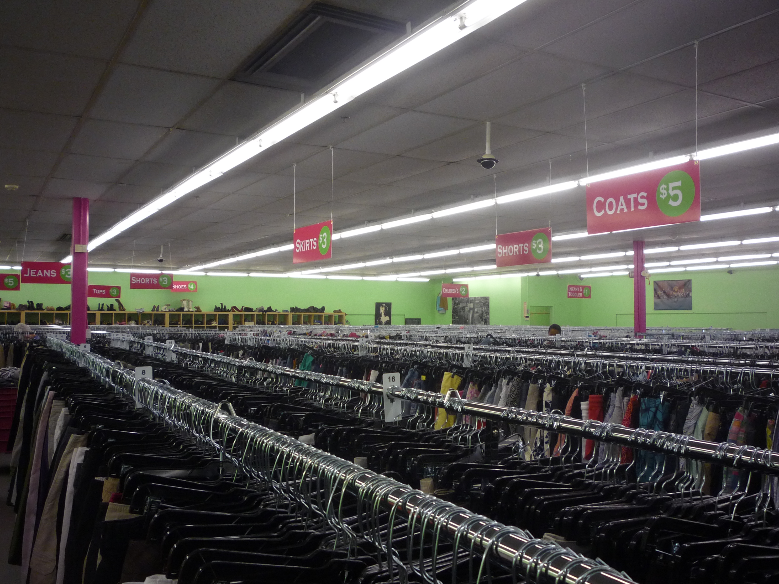 Prepare yourself for this bit of groundbreaking retail clothing news to avoid a wardrobe malfunction: coats, blazers, dresses, two piece suits and handbags are $5 each; shoe, sneakers, boots and sandals $4 each; jeans, pants, skirts, shorts, activewear and tops $3 each; children’s clothing, costume jewelry and most earrings $2 each; and toddler and infant clothing, gloves, scarves, belts and wallets $1 each.
