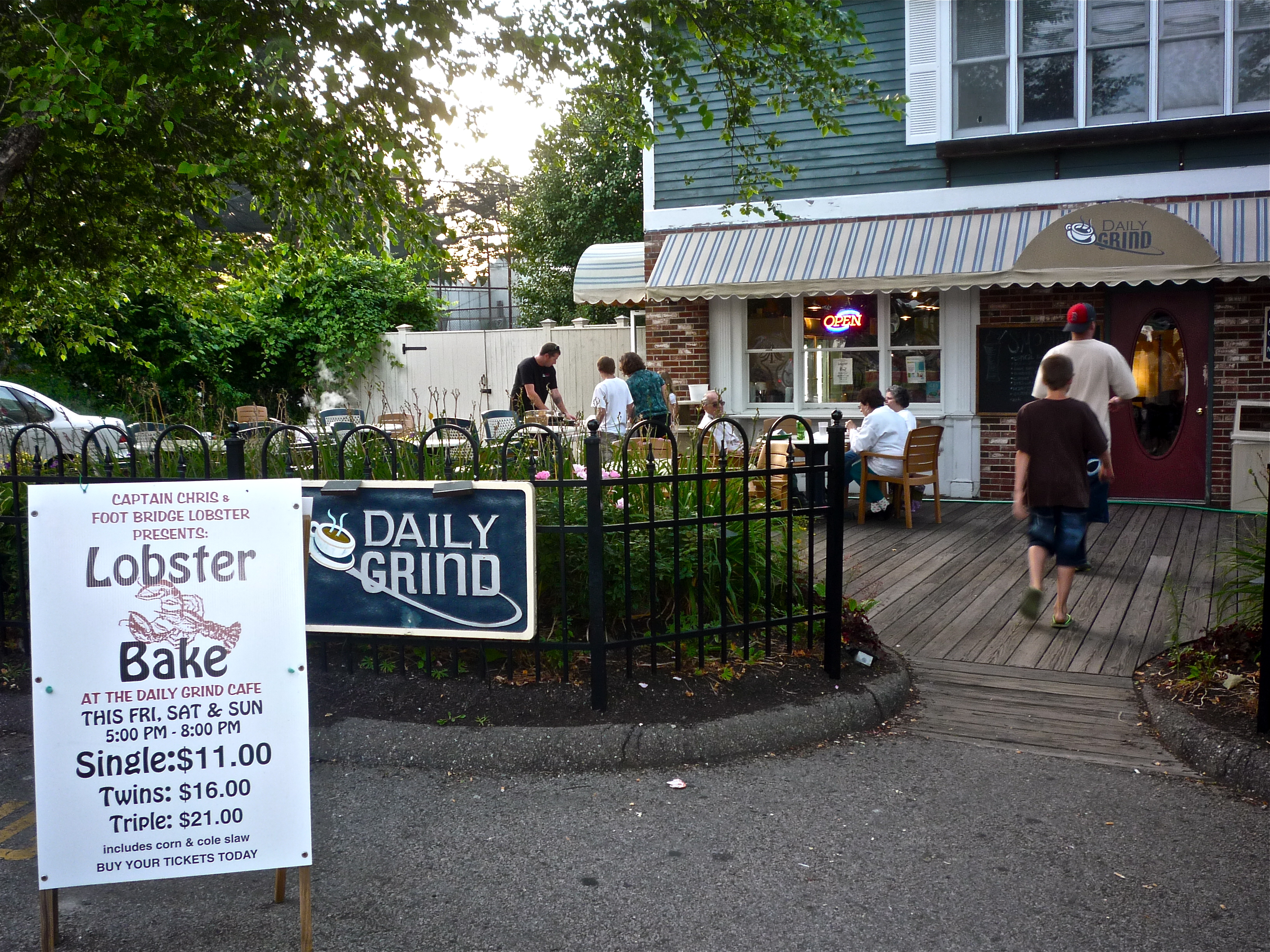 A few hours later while strolling downtown York Beach, Maine, we noticed The Daily Grind Cafe (21 Railroad Ave.) offering single Maine lobster at $9, twins at $16 and triples at $21. Who would have thought a place known for excellent coffee, baked goods and paninis serving lobster on a weekend evening at much lower prices than a famous seafood restaurant specializing in this legendary Maine shellfish? Just goes to show that real bargains abound out there for lobster, and you need not go to a renowned New England seafood restaurant for the best deals.